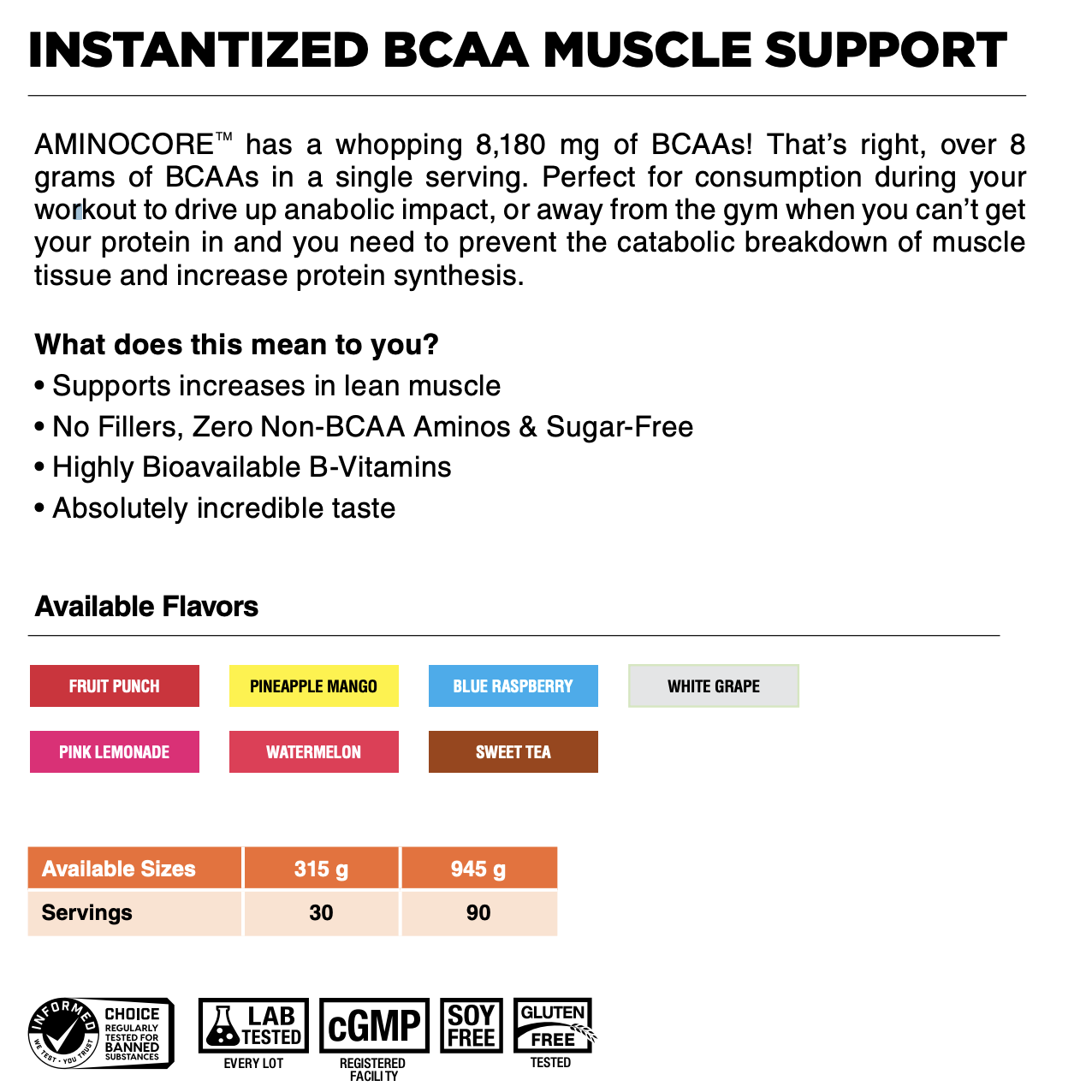 AMINOCORETM has a whopping 8,180 mg of BCAAs! That’s right, over 8grams of BCAAs in a single serving. Perfect for consumption during your workout to drive up anabolic impact, or away from the gym when you can’t get your protein in and you need to prevent the catabolic breakdown of muscle tissue and increase protein synthesis.