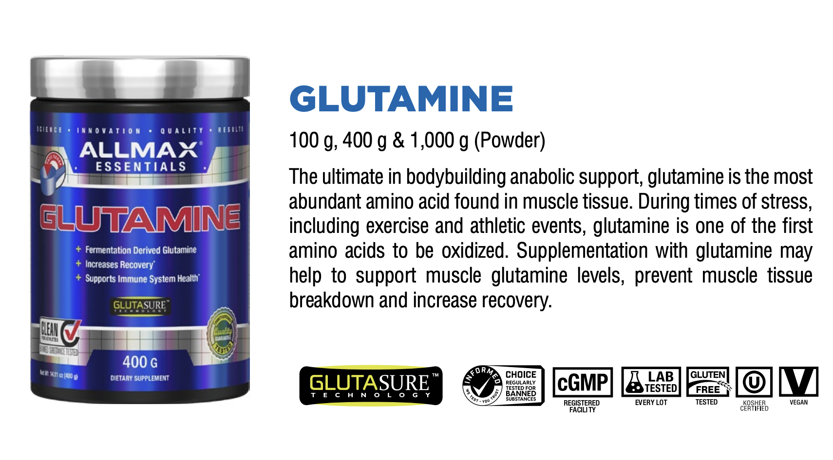 The ultimate in bodybuilding anabolic support, glutamine is the most abundant amino acid found in muscle tissue. During times of stress, including exercise and athletic events, glutamine is one of the first amino acids to be oxidized. Supplementation with glutamine may help to support muscle glutamine levels, prevent muscle tissue breakdown and increase recovery.